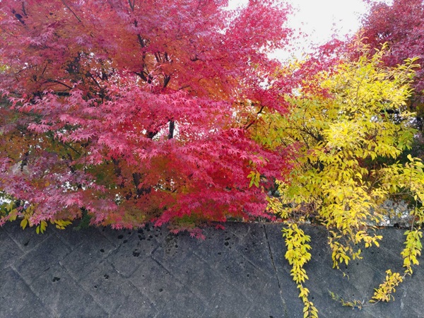 特に名所の紅葉でもなく、猿ヶ京方面ので街中の石垣の上の紅葉。